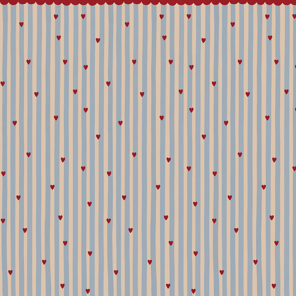 Our patterns are heavily inspired by France. This wallpaper feels so wonderfully French, we even named it that. Beautiful pastel stripes with 5 cm dark red hearts. We've topped this wallpaper with a garland in the same color to give it an even more fairytale feel.