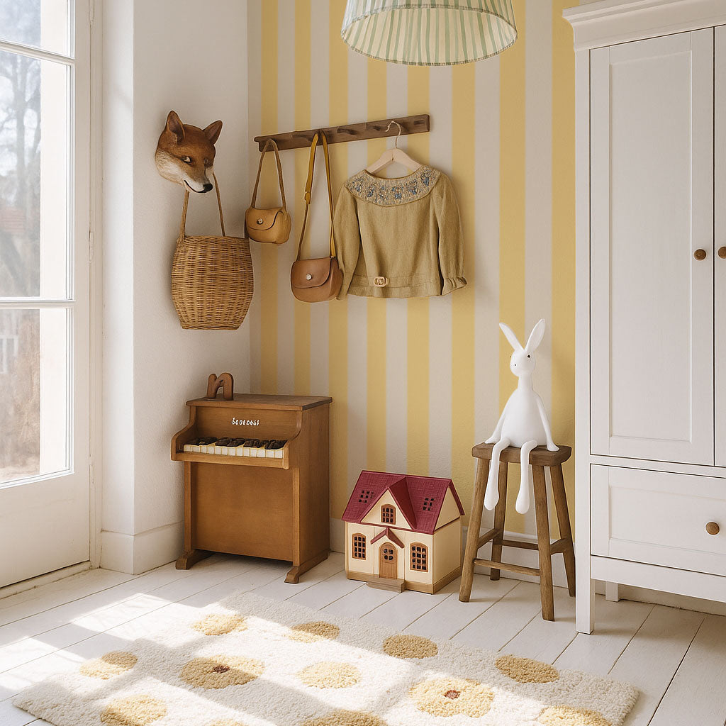 The narrow wallpaper stripes guarantee that the wallpaper will fit almost perfectly to the width of the wall. What’s more, the repetitive pattern, where each of the stripes looks identical, allows the pattern elements to flawlessly arrange on the wall once we glue the wallpaper starting from the ceiling. Thanks to this, there is very little surplus material.